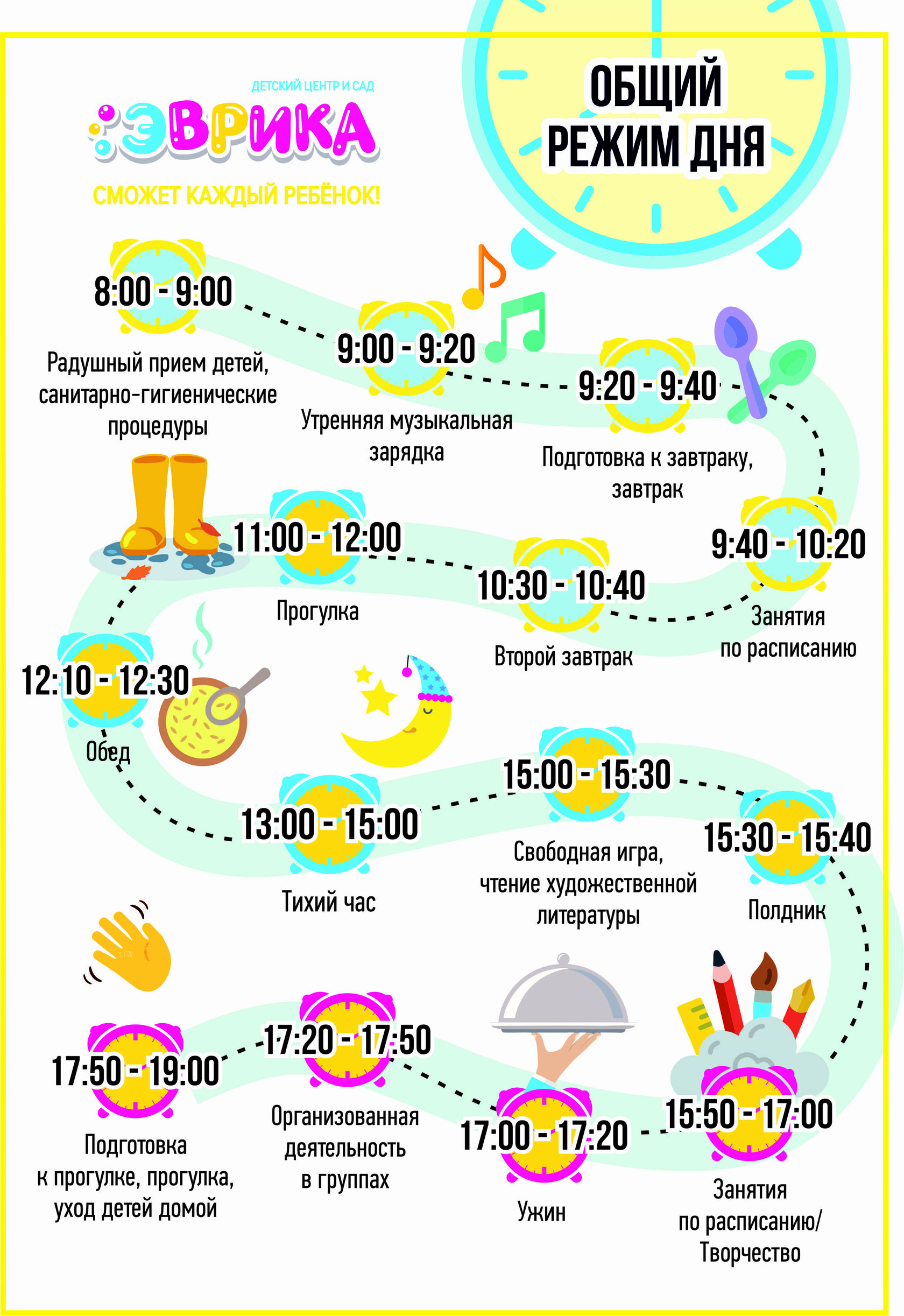 В ежедневное расписание детей включены общеразвивающие занятия, логоритмика, подготовка к школе, английский язык, музыка, творчество, активные занятия и игры.
